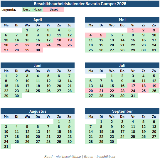 Kies jouw gewenste periode en ontdek de vrijheid van reizen met onze Bavaria camper. Boek vandaag nog jouw onvergetelijke reis!